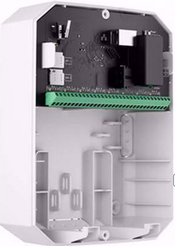 Hibridna alarmna centrala. Bele boje. Ugrađen bežični modul, LAN + 2G modem. BUS linija na ploči - 8kom. Podržava do 100 žičnih/bežičnih uređaja, podržava do 25 kamera/DVR-ova, do 5 proširejna dometa, 50 korisnika, 9 particija, 32 scenarija.