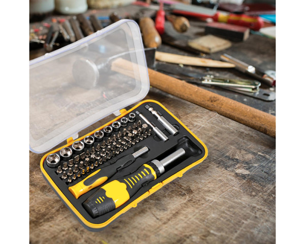 - 20x bitova od 4mm, 31x bitova od 6mm, 2x produžetak 60mm, 1x 4mm šrafciger sa rotirajućom drškom, 9x nasadnih ključeva