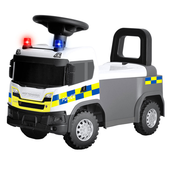 Guralica dizajnirana po modelu automobila Guralica Scania, u beloj boji, predviđena za decu uzrasta 18+ meseci. Naslon na sedištu pruža dodatnu sigurnost tokom vožnje. Guralica emituje svetlosne i zvučne efekte.