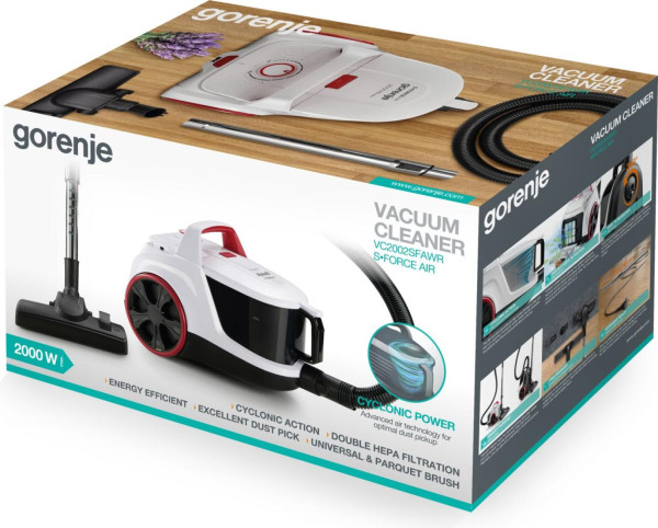 S Force, snaga motora: 2000 W, usisna snaga 350 W, dvostruka HEPA filtracija, univerzalna četka, dodatna Parket četka, teleskopska cev, zapremina posude 3 l